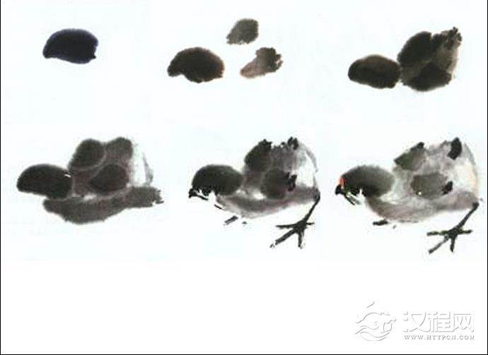 小鸡羽毛绒细,天真活泼,富有稚气,为人们所喜爱。绘画步骤:首先点厾头和双翅,如图①、②;其次画脊背,如图③;再次画颈胸、腿和臀线,如图④。换重墨毛笔添嘴、眼、跗蹠、趾和翼、尾尖,如图⑤,至此全鸡基本画完,最后换彩笔加冠和臀部的肉色。