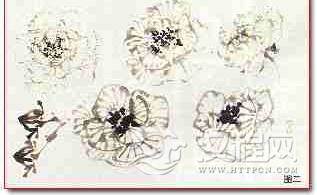 浅粉色芙蓉,可用淡墨勾勒花和纹络,用墨点画花蕊。也可类似白色月季的方法处理,只在瓣的顶部略染淡红。其它用淡草绿色圈染复勾花瓣,再用薄粉染(见图二)。