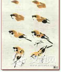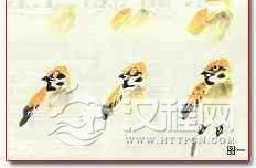 麻雀为常见小型鸟,种类很多,一般多画的是家雀,其雌雄相似。客和头劲部为褐色,腹部为灰白色,背也为褐色,有黑褐色花斑,尾与飞羽为黑褐色。头与颈的两侧为白色,且有一黑色块斑。画时,麻雀的褐色可画成赭石色,可直接用赭石,也可用赭石调墨画。麻雀背部花斑可用墨点,但不要点画得太整齐。飞羽和尾虽是黑褐色,但画时可用深浅墨画。嘴部用墨勾画,后用淡墨染。胸部用浅灰色略深,至腹部要浅。用笔要有虚实变化(见图一 、图二、图三)。