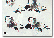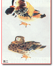 雄鸳鸯的羽毛,颜色漂亮复杂。雌鸟与麻鸭相似,羽毛颜色较单纯。画雄鸟从头部画起,先画头顶黑羽,再画嘴,后用散锋点画腮后乍起的羽毛,然后圈眼。定好位置勾画黄赭色向上翻翘的扇形羽,再点其他飞羽,然后点画背部,与头相接,再添画另一侧的扇状羽和飞羽。用紫黑色点画胸部。胸后部有两条白纹,点画胸时要留白。腹部用赭色上深下浅向后一笔画出,收笔处要浅白。在水中游时,因其下部在水中,应用水纹遮挡。在陆上时,可用浅墨勾出,同时画有蹼的爪。墨干后,再染以相应的颜色。嘴 是红色,在腮部和后乍的毛连接处染赭石,要前浅后深。眼周围色更浅。用淡红染上复羽,下复羽染白色。在头顶和飞羽等重墨部,染石绿石青,表现羽毛闪出的光泽。后乍的毛可再用深紫色丝点一下。爪在勾画以后,用红点染(见图一、图二)。