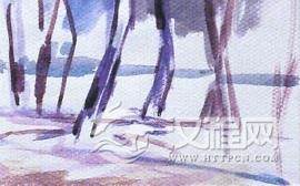 本局部取的是远景部分,用大笔角、薄画法来表现大体色彩关系,从放大的局部可以看出它的色彩对比较弱、变化小。