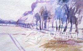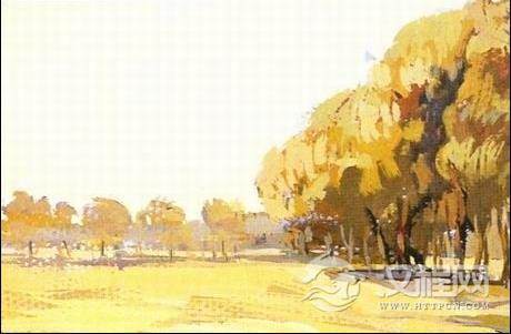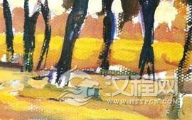 用中黄、柠檬黄、紫罗兰等颜色来表现麦田、地面;用中黄、土黄、紫罗兰、深红、深绿等颜色来表现树;用中黄、紫罗兰、白等颜色来表现天空。注意在画麦田、树木、天空时,它们的颜色都不要太死,要有变化。调色一般不宜超过硬种颜色,否则会画灰。
