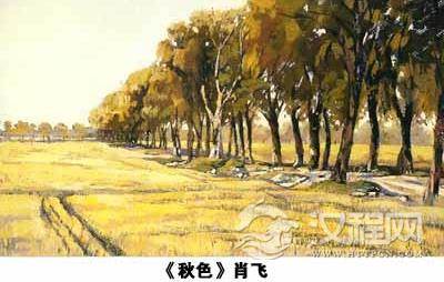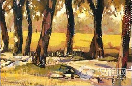 中、前景的麦梗、树身色彩对比强烈、层次清晰丰富。注意不能孤立看一点色彩,应与其他地方比较,不能死盯着一个局部画,否则画面将失去平衡。