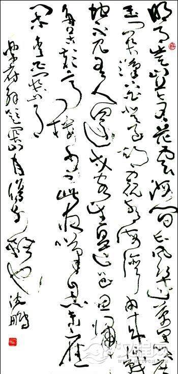 9当前写草书者颇不乏人,而进入狂草者甚少。我们时代充满着快速的节奏,呼唤着昂扬进取的精神,也决不排除视觉的刺激性。可是相比之下,狂草的凤毛麟角令人遗憾。这首先是狂草书法难以理解,接受者少。对书写者来说,学习的难度大,不仅写好楷书、行书不足以尽狂草的基本功,而且甚至写好一般草书要进入狂草也还要有一个质变的过程。狂草有其自身的规律性。狂草要有更高的创造力,其重要特点也是难点之一,是要打破“行”与“列”的界限,在不损害字体规范化的前提下使字的结构变形,上下覆盖,左右通达,实现有限范围内的无穷变化。它不是简单的一般草书的扩充。狂草写长轴固然是最常见的一种形式,而横卷因其宽度有很大的扩展余地,所以能有大的发挥,取得意想不到的效果。