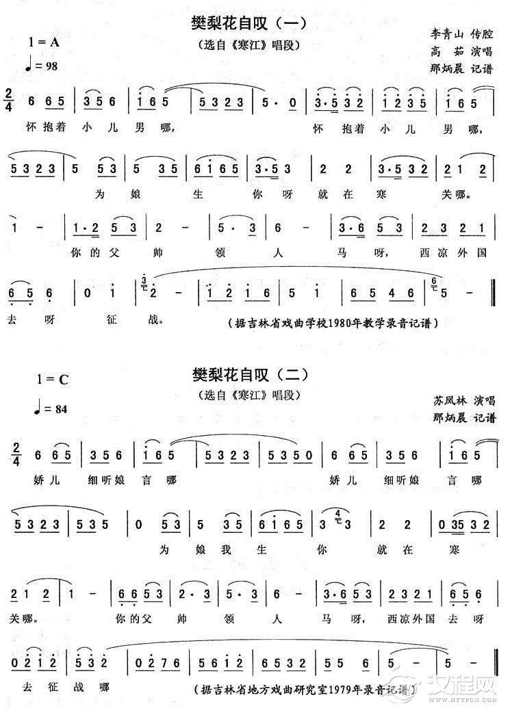 戏曲曲谱樊梨花五更(《寒江》唱段)