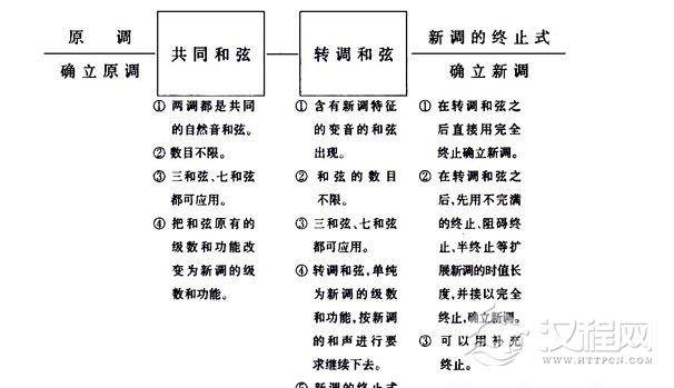 近关系调的转调采用两调共同和弦过渡的方法进行转调。转调过程分为四个步骤:1、确立原调,2、应用共同和弦,3、引出转调和弦,4、确立新调。如下图所示: