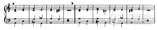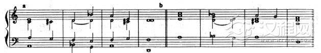 小调向下属小调转调时,常用原调的IV级(等于新调的主和弦)为共同和弦,在它的后面可接新调的下属功能组或属功能组和弦,在转调上非常方便。如下图: