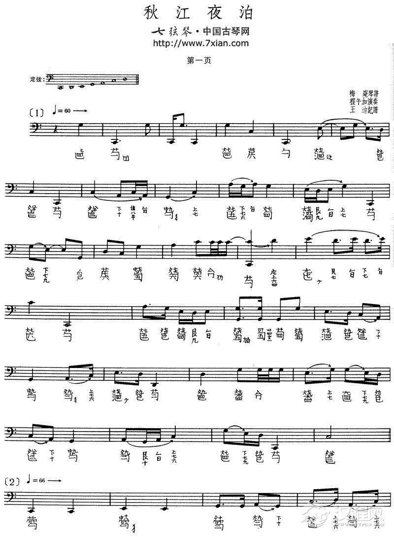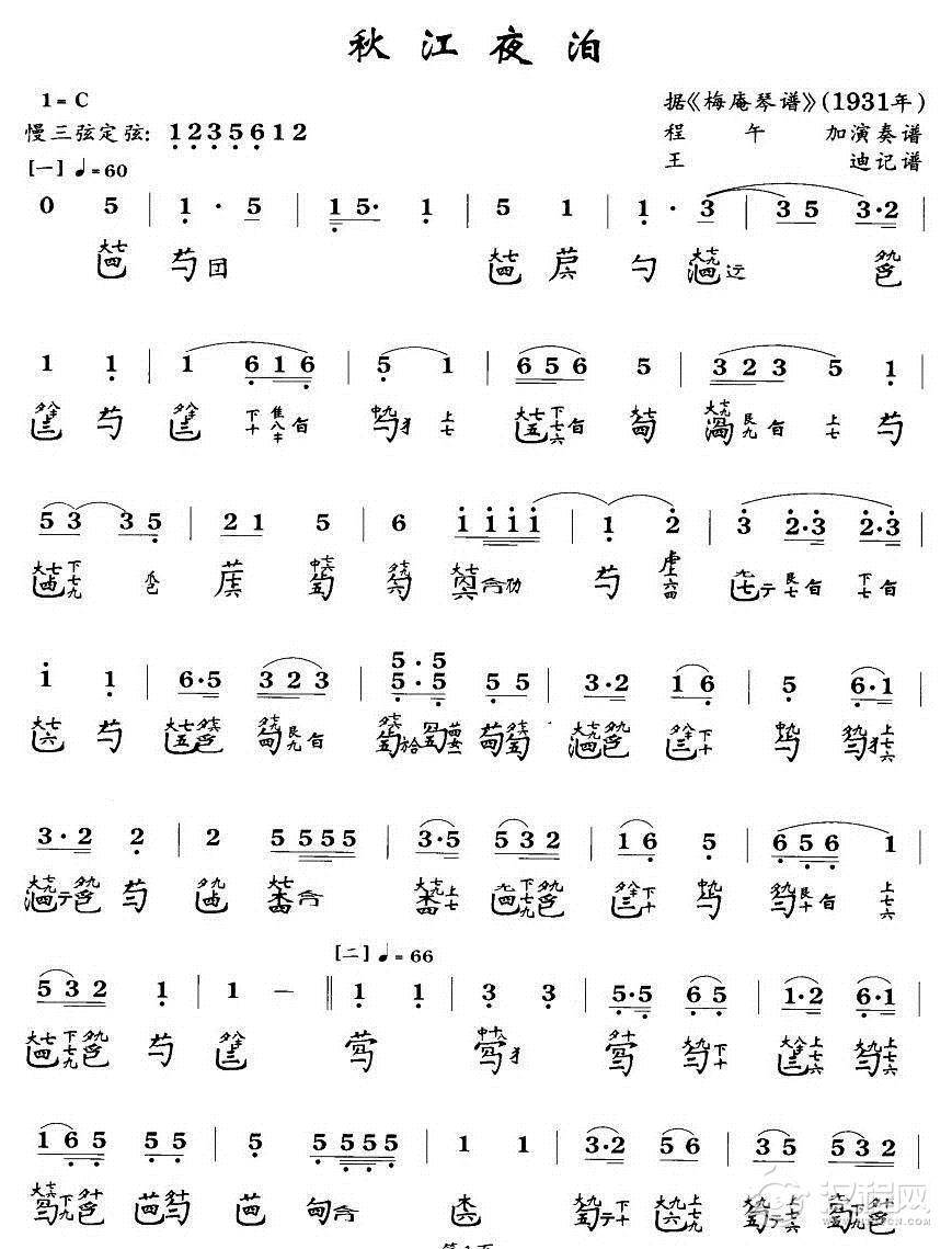秋江夜泊(程午加演奏版、古琴谱、2个版本)
