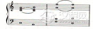 根音下行三度进行时,前后和弦之间有两个共同音,由于后一和弦的根音是新的音,因此在力度上也有较强的作用,具有较柔和的色彩。三度下行有大、小三度的差异,大三度下行时,后一个和弦的肯定作用较小。三度下行的运用也较多,在作品中一般作为中间型的和声连接作用。如瓦格纳《帕西法尔》: