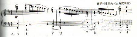 根音二度进行的和弦之间没有共同音,和声性的联系因素少,旋律性作用强,属于特殊的强进行。从传统的实际使用来看,二度上行比较二度下行的力度要强,运用也多。如图: