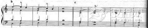 延留音是由前一和弦的某一和弦音延留下来的所构成的和弦外音,它发生在抢拍或强的音节,通常采取下行级进到和弦音的方式。因此延留音的运用过程可分为三个部分:预备—延留音—解决。延留音的标记和在延留音的上方一“留”字或“S.”(S.是延留音英文名称suspension的缩写)标记。如图: