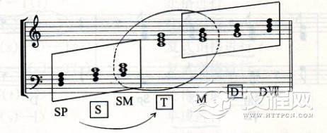 以调性的三个和弦为中心,它们的上、下三度关系的和弦与中心和弦构成功能组。如图: