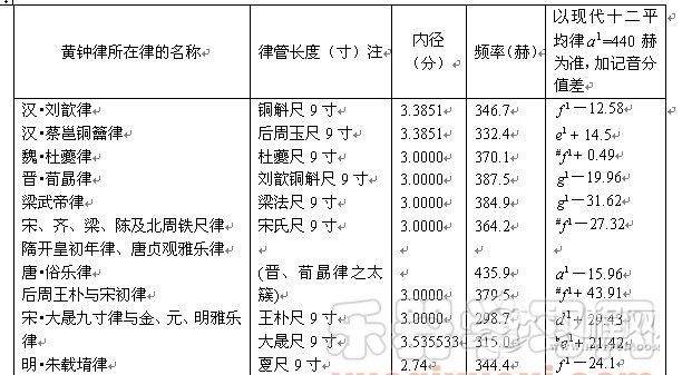 注:不论在冲弦律或在管律,黄钟律的标淮音高是一致的。弦除了长度外,又因张力大小而异其音高,而律管无此现象,所以黄钟律以律管定音。