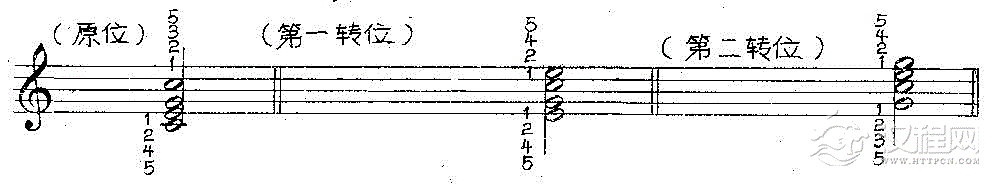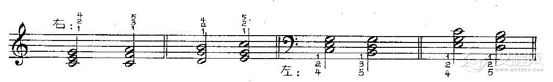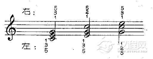 如果是三和弦,不管它为原位、第一转位或第二转位,不管是右手还是左手,其和弦高低音,都用1、5指;其中间音与5指弹奏音构成三度时用3指,构成四度时则用2指。如: