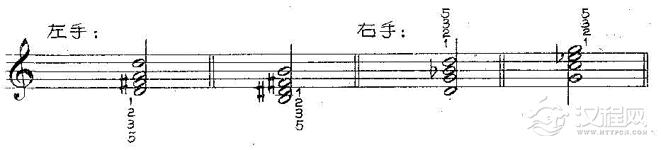 但要注意,左手弹奏的加八度和弦原位和右手第二转位出现黑键音时,如5指弹奏的音与相邻和弦音构成大三度音程,则应该采用1、2、3、5指法: