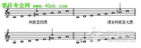 利底亚调式与自然大调的不同之处,是第iv级与主音构成增四度,这个音是该调式的特征音,称“利底亚四度”。