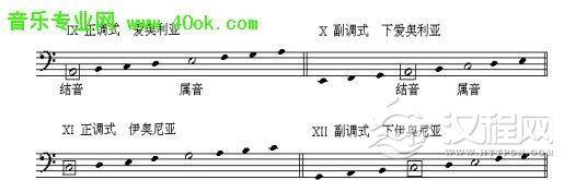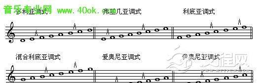 以上六种调式中,爱奥尼亚调式与我们熟悉的自然小调相同,伊奥尼亚与自然大调相同。