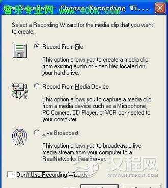 (1)在(图20)所示的第一步向导设置窗口中提供了三种Real文件的制作方法:“Record From File”表示将机器中的其它格式媒体文件转换为Real格式文件、“Record From Media Device”表示将由麦克风、录像机、CD/DVD等外部设备传送得到的数据来制作Real文件、“Live Boardcast”表示从本机进行实况广播,在此我们选择第一个选项。