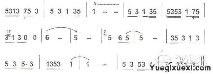 克木人情歌旋律细腻委婉,节奏舒展自由,歌头甩腔和歌尾衬腔,以“5-1”为骨干音型,在八度音域内围绕骨干音型运行,终止音为"3”。如图:勐腊县克木人《串姑娘调》(节选)