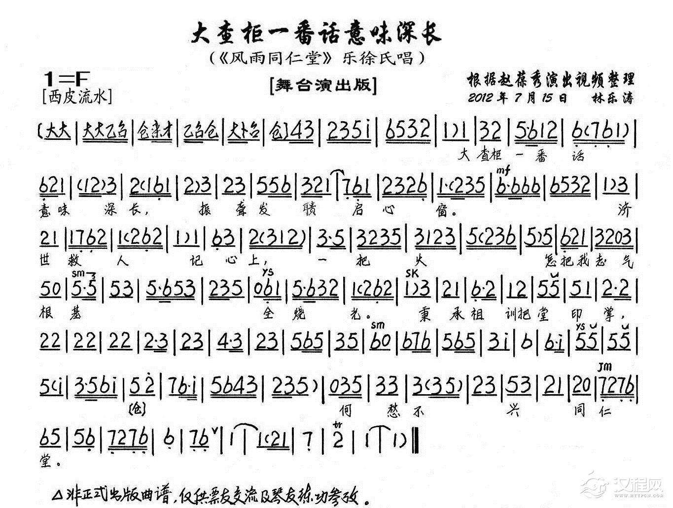 戏曲曲谱同仁堂在京城金匾煌煌(《风雨同仁堂》乐徐氏唱段、琴谱)
