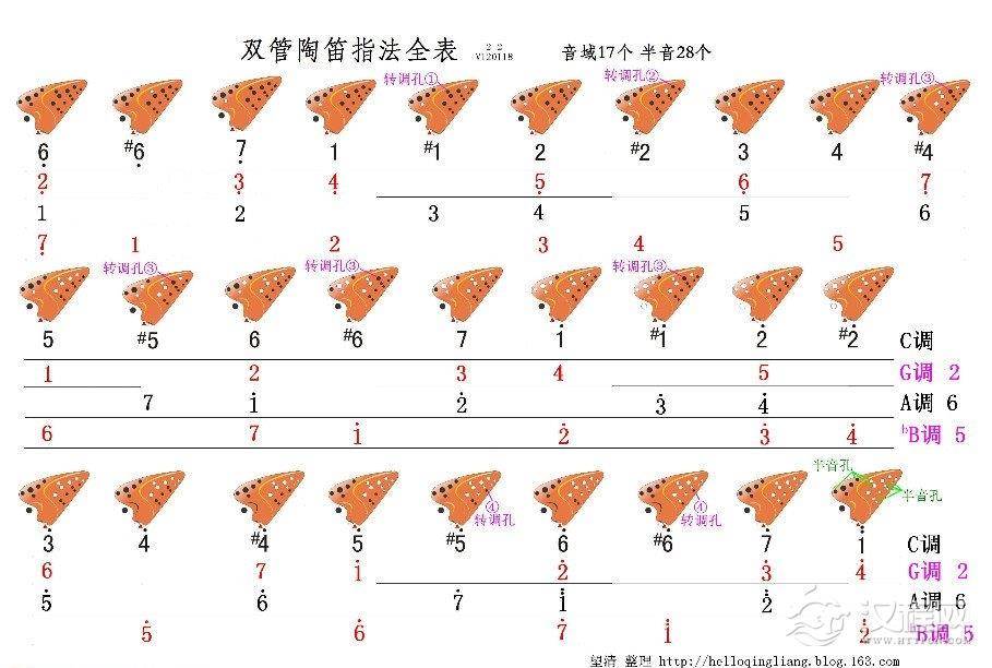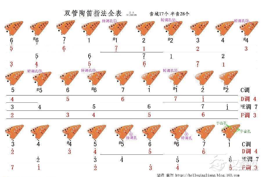 适合风雅熏烧双管和无光白双管和其它品牌的大部分双管陶笛。含所有半音,所有转调指法。