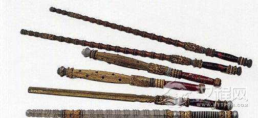 短打武器。圆节鞭、狼牙棒、锏、方节鞭均木质,其形制各异。方节鞭通体涂银粉,鞭体上部饰金漆束腰莲瓣纹。柄缠布质彩带,饰金漆莲瓣纹。锏身扁长柱形,两侧棱角为刃,面中间内凹涂金粉,柄髹黑漆绘云蝠纹。锏为单用,亦可双用。如清宫乱弹单本戏《千秋岭》中,秦琼出场即持双锏。狼牙棒,棒体六棱形,排钉,涂金粉,柄髹朱漆。狼牙棒在戏中使用,远不如刀、剑等广泛。如清宫单出戏《恶虎村》中武天虬、连台戏《封神天榜》中温良所执兵器,即为双狼牙棒。圆节鞭,竹节形,共1 7节,上小下大,顶端为圆形,在14节处饰仰俯莲瓣纹。鞭可双用,亦可单用,如清宫单本戏《收虎关》中高旺使用单鞭、《雁翎甲》中呼灼用双鞭。