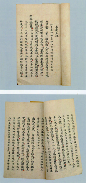 《喜朝五位岁发四时总本》(南府抄本)。所谓总本,即包括全剧人物上下场、唱词、念白及动作等内容的剧本。此剧本书衣黄色,红书签双栏,墨笔楷书“喜朝五位 岁发四时”八字,书页无框栏行格。半页八行,行一十字,小字同,抬头行一十一字。墨笔楷书,朱笔句读。 本二出,昆腔。此本是清代宫廷月令承应戏——元旦承应剧目之。乾隆时,南府于元旦正三刻入重华宫,卯初在重华宫漱芳斋大戏台为乾隆皇帝首演此剧,然后再续演其他剧目。