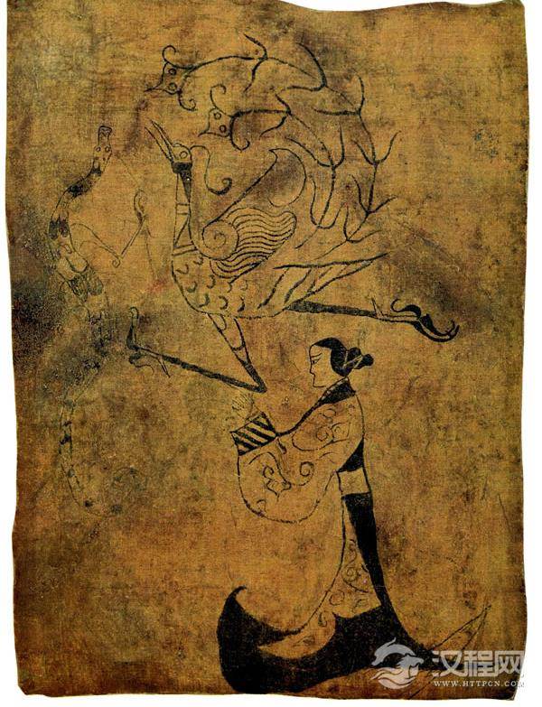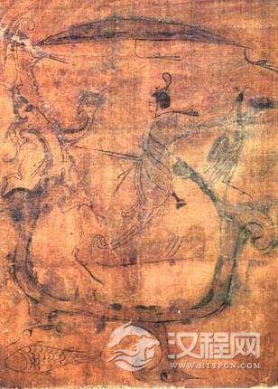 《人物御龙图》,1973年出土于湖南省长沙市子弹库楚墓,长37.5厘米,宽28厘米。画中是一个中年男子形象,他头戴高冠,身穿长袍,一手握剑,一手拉缰,驾龙升仙。该画的主题与《人物龙凤图》相仿,形式也近似,但在构思和表现上有着更高的水平。人物虽也采用侧面,但形象非常写实生动。《人物龙凤图》中的女子似乎在祈求龙凤来援引她升天。而此画中的男子将威力巨大的龙踩在脚下,手挽缰绳,象御车放舟一样,使其按照人的意志,乘风驰骋。尽管它的主题仍是升仙,但所包含的意义要积极得多。它的用笔因物象的形体、质地和运动,而有粗细、刚柔等多种变化,并有意识地加强若干线纹飘动来显示前进的方向和速度。请登录会员阅读全文。转载时请注明:来自 /