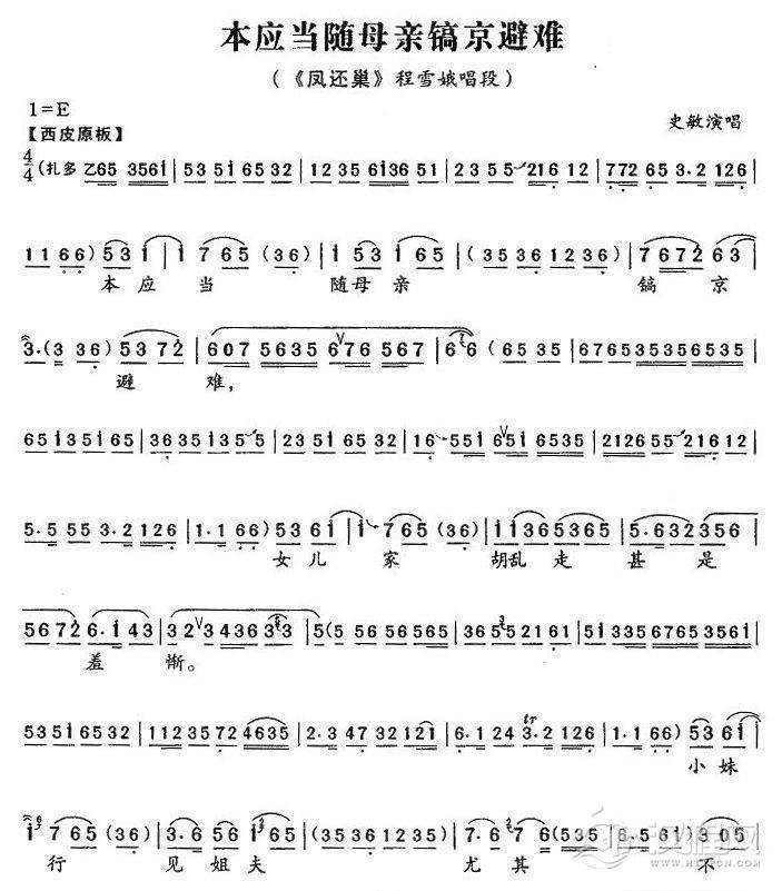 戏曲曲谱本应当随母亲镐京避难(《凤还巢》程雪娥唱段、琴谱)