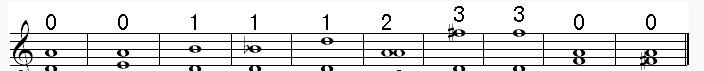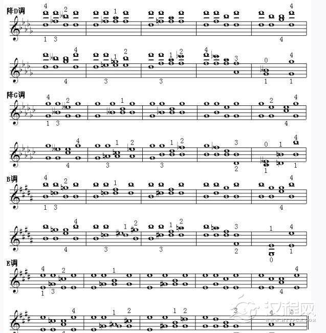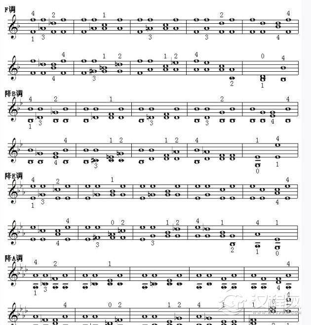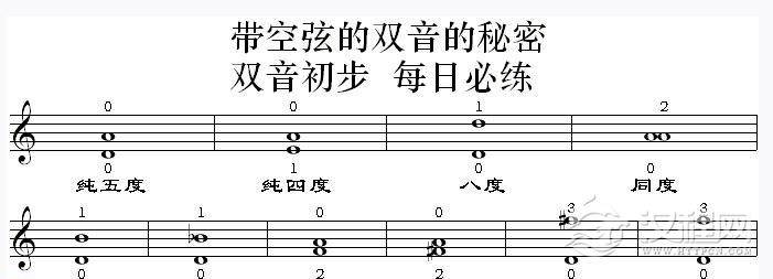 注意:前四组是五度相生律的标准。后六组是纯律的标准。纯四度的一指与大六度的一指不在一个五度相生律的纯五度横线上,两者相差1至2毫米,依据琴的大小不同而定。这个练习所要达到的目的就是锻练耳朵的听力,要听到完全和谐的双音为止。可用下面这行谱子练习。