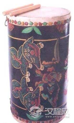 鼓框杨木制,呈桶形,两面蒙水牛皮。高71、面径38厘米。鼓身涂红或黑色磁漆,粘贴彩绘花篮图案或耍狮舞图案。