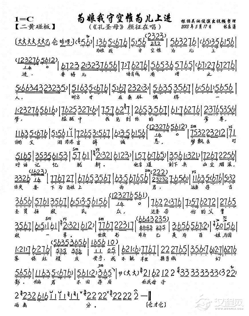 戏曲曲谱叹颜氏命多舛孤零贫困((《孔圣母》颜征在唱段、琴谱)