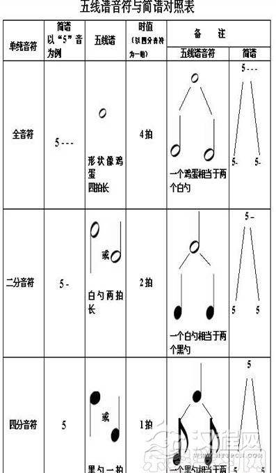 五线谱音符于简谱对照表