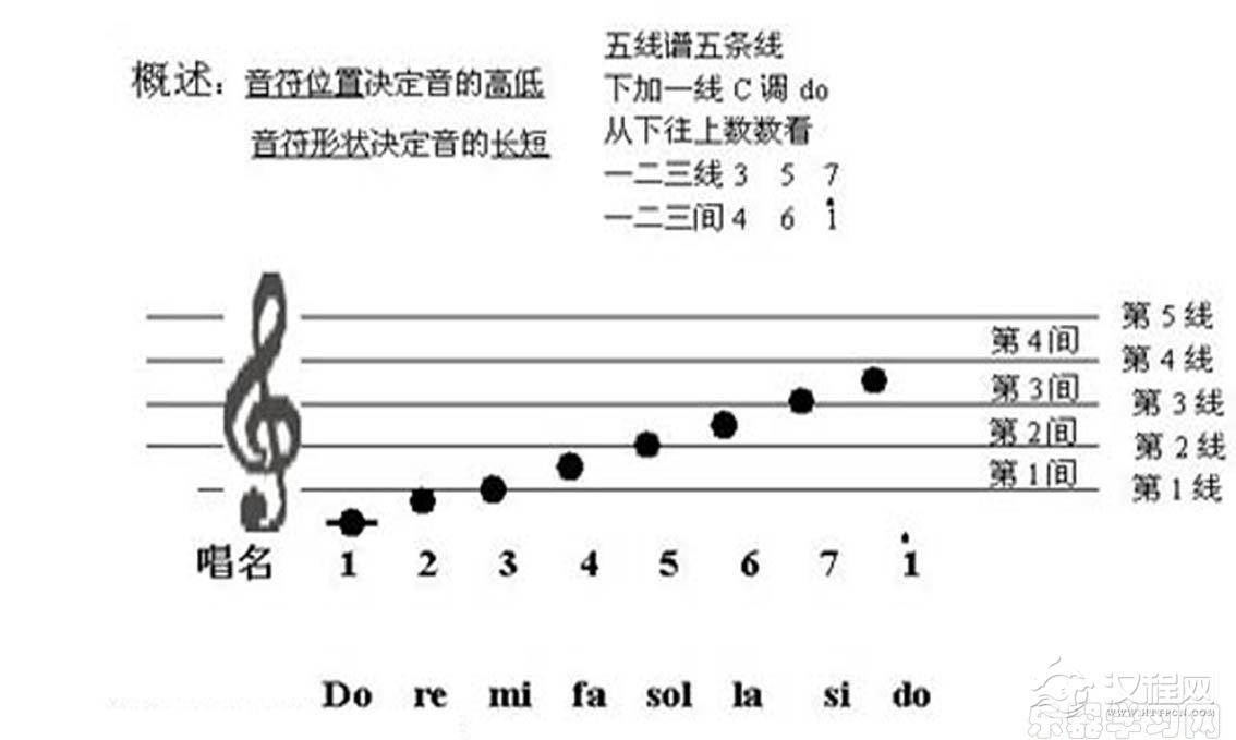 口诀:五线谱五条线,下加一线C调do,从下往上数数看,一二三线3、5、7,一二三间4、6、1(高音do)