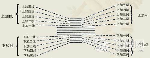 这些临时多出来的“线”和“间”叫做“上加线”和“下加线”。上面多出来的线叫做“上加线”,上面多出来的“间”叫做“上加间”。下面多出来的“线”和“间”叫做“下加线”和“下加间”。这些“线”和“间”向上下两边呈放射形。“上加线”和“上加间”是自下而上,往上数的,分别叫做“上加一间”、“上加一线”、“上加二间”、“上加二线”、“上加三间”、“上加三线”…………以此类推。