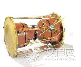 鼓身用一段椿木、桦木或杨木(多块木料拼合也可)掏空或旋制而成。全长56厘米~70厘米,两端鼓腔粗而中空,中间鼓腰细而实心,呈两个倒接的脚杯状(图)。左端鼓腔长18厘米~22厘米、鼓口直径24厘米~26厘米,右端鼓腔长16厘米~20厘米、鼓口直径22厘米~24厘米,中间鼓腰直径10厘米~12厘米,从而形成两个大小不同的共鸣腔。鼓身外表涂以红漆,绘有描金花纹图案。左端鼓腔稍大,多蒙一块较厚的牛皮、马皮、驴皮或猪皮,以使其发出柔和、深沉的低音;右端鼓腔略小,多蒙一块较薄的鹿皮、羊皮或狗皮,以使其发出清脆、明亮的高音。皮面缝在两个直径41厘米~48厘米的圆铁圈上,分别盖于两端鼓口,铁圈四周各置八个铁钩,拴以皮条或鼓绳,相邻两绳间穿以可活动的皮套(又称浮转),左右移动皮套可调节鼓皮张力。左右两端分别称为手鼓面、棰鼓面,都无固定音高,一般将其调成四度或五度音程关系,并能根据演奏的需要来定音。鼓棰用竹条或细竹制作,棰长40厘米。#p#分页标题#e#