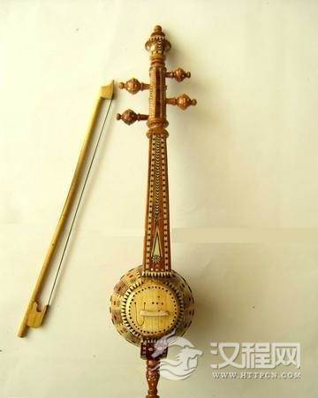 由共鸣箱、琴头、琴杆、弦轴、琴马、琴弦和琴弓等部分构成(图)。共鸣箱呈扁长方形,用铅铁板弯合制成。箱长24厘米、宽18.5厘米、高11厘米,琴箱正面靠外侧开有装入琴杆的通孔,右侧箱壁中间开有一个圆形出音孔,孔径3.5厘米。琴头、琴杆用一块木料制作,民间常用松木或柳木制成,上细下粗,呈圆锥形,全长56厘米。琴头顶端稍细,弦槽后开,两侧设有二至四个核桃木制T形弦轴。琴杆为圆形柱状体,无按弦指板,上端设有环形山口支弦,下端装入琴箱中并露出箱外。琴箱正面置有支弦琴马,琴马用核桃木或杏木制作,呈圆拱桥形,马长3.3厘米、高1.9厘米、宽0.5厘米。张二至四条钢丝弦,里弦最粗,依次渐细,外弦最细。琴弓用柳木或杨木制作弓杆,两端拴系一束马尾为弓毛,弓长45厘米。?