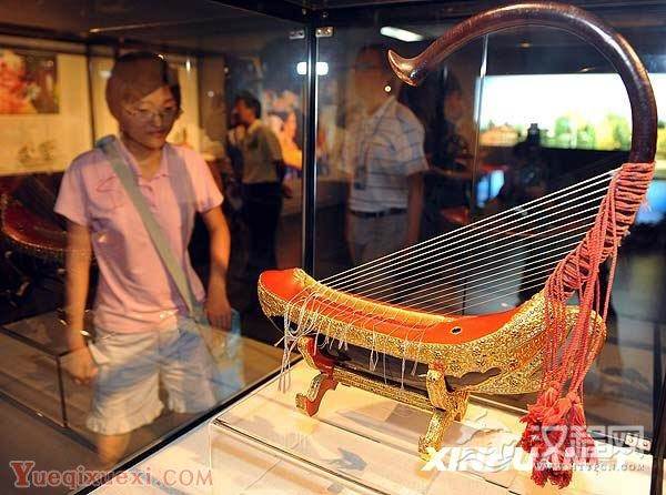 在北京中国艺术研究院音乐研究所的中国乐器博物馆里,珍藏着一架外表华丽的凤首箜篌,它与《新唐书》、《通典》、《乐书》和《大清会典图》所载及附图完全相同。琴体用硬木制成,全长96厘米、高86厘米。共鸣箱呈船形,长68厘米、宽16厘米、高17厘米,在腹腔上面盖有一块中间掏空的桐木面板,中空处蒙以蛇皮。皮面中央置一条形木板,琴弦下端穿系于该板弦孔。琴弦上端穿过琴颈弦孔,用黄丝绳拴在弯曲的琴颈上,下垂有黄色丝穗。张有13弦,琴弦采用两种粗细的丝弦和肠衣弦。通体髹浅棕色漆,其上描绘粉红色荷花、深绿色荷叶等花卉纹饰。制作工艺精湛,外观堂皇富丽,堪称缅甸传世珍品。但制作和传入年代不详。原为我国著名京剧表演艺术家程砚秋先生藏品。1958年程先生将自己珍藏多年的186件古今民族乐器,全部无偿捐献国家,其中就有这架凤首箜篌。#p#分页标题#e#