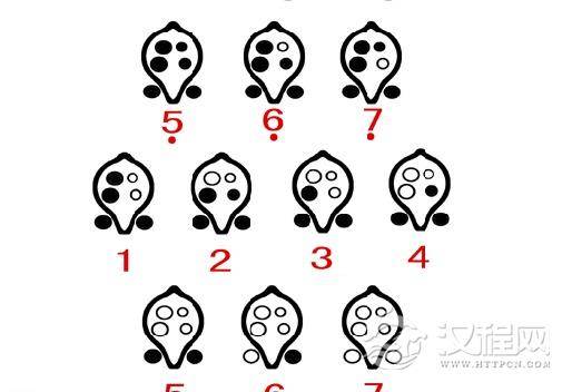六孔陶笛采用不同指法常用以下三种: