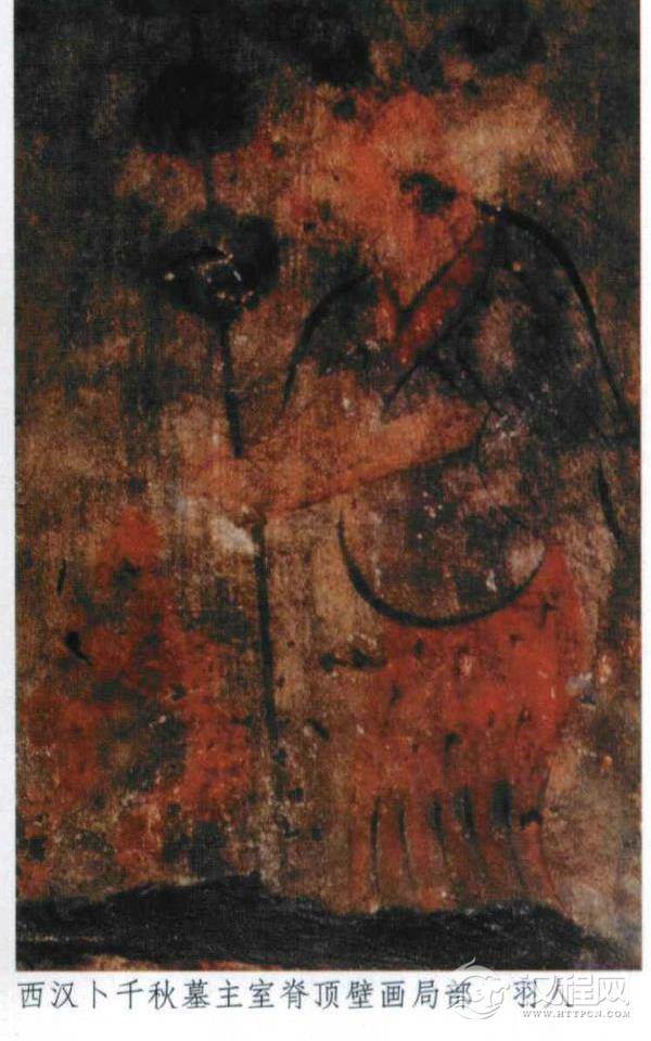 洛阳卜千秋墓壁画,原在河南省洛阳市烧沟村附近,1976年由洛阳市博物馆发掘,据出土印章,墓主为卜千秋。该壁画今存洛阳市古墓博物馆,是已发现的汉墓壁画中最早者。卜千秋墓壁画的位置及幅面形式特殊,它的主体部分画在二十块特制的长方形空心砖上,后并列拼成屋脊的狭长带状平面,画面朝下,与墓室底面平行。画面两端至前后山花处,分别折而向下。其折向后壁山花的一段,向左右扩展而呈梯形。壁画内容是男女墓主人分别乘龙持弓、乘三头凤鸟捧金乌,以持节仙翁为前导,在各种神兽的簇拥下,飘然升仙。天界的神灵有:人首蛇身的伏羲和女娲,内有金乌的太阳和内有桂树、蟾蜍的月亮,代表天地四方的青龙、白虎、朱雀和玄武四神。此外还有“索室驱疫”的方相氏、人首鸟身的仙人等。此墓壁画的制作过程是,将空心砖粉刷、绘制后编号,再依次砌筑刊坫室中去。由于地面上有较墓穴里远为宽敞便利的条件和充足的光线,有利于充分发挥作者的技能,所以此壁画比其他所有汉墓壁画都要精工,在设色和用笔上都代表着汉墓壁画的优秀水平。