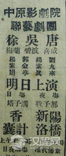 吴碧波因家庭贫困,十一岁到开封市和平戏院学戏,拜老艺人赵清和为师。于1951年参加了河南军区后勤部联艺剧团,1953年由部队转到地方,也加入了河南省人民剧团。从他们简历可以看出,他们那时就在一个剧团唱戏。从下面三张戏单,可以见证他们解放初就已经成名,名字能写在戏单的显著位置,成为剧团的主演。那时吴碧波才二十来岁,唐喜成也不过三十,和现在省豫剧青年团的年龄大体相当。