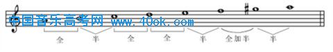 小调音阶与大调音阶不同,它的模式是:“全、半、全、全、半全加半、半”,
