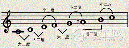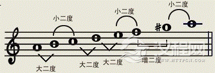 和声小调:把自然小调的ⅶ级音升高半音,叫做“和声小调”它的音程结构是这样的。