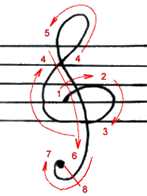 画这个谱号是从第二间开始的。从第二线开始向上紧靠着第三线顺时针往下画半个园,再紧贴着第一线画一个大于起口的圆形,然后,躲开这个圆形的开始的缺口,向上、向右、冲出第五线再向左,逆时针画一个小圆,回来,在第四线上定义。然后,从中间下来,穿过第三线、第二线,再穿过第一线,伸出尾巴来后,再左转,顺时针画半个小小的圆,结束时涂上一个小黑点点。这样,一个高音谱号就可以大功告成了。看起来复杂,实际画起来你会发现并不是很困难的。