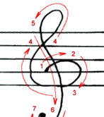 画这个谱号是从第二间开始的。从第二线开始向上紧靠着第三线顺时针往下画半个园,再紧贴着第一线画一个大于起口的圆形,然后,躲开这个圆形的开始的缺口,向上、向右、冲出第五线再向左,逆时针画一个小圆,回来,在第四线上定义。然后,从中间下来,穿过第三线、第二线,再穿过第一线,伸出尾巴来后,再左转,顺时针画半个小小的圆,结束时涂上一个小黑点点。这样,一个高音谱号就可以大功告成了。看起来复杂,实际画起来你会发现并不是很困难的。