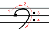 低音谱号就要容易得多了,您画这个谱号时要记住;要从第四线上画起。先画一个小小的圆点,然后紧贴第五线,顺时针画半个圆,穿过第四线向左一撇,直到第二线止住。再在第三间和第四间里各点一个小小的圆点。