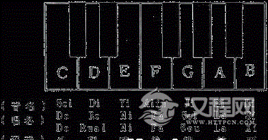 这七个音在钢琴上都是穿着雪白的衣服(白键子)。现在我们把这七个基本音的音名、唱名、译音、简谱记法全部在钢琴上做个对照。