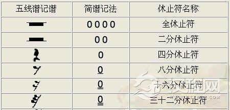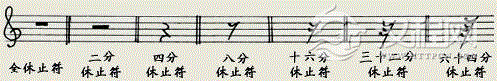 各种音符都有相应的休止符号,它们与相对应的音符的音值是一样长短的。