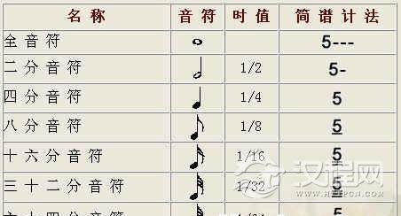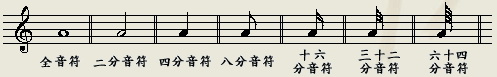 不同的音符代表不同的长度。音符有以下几种: 全音符、二分音符、四分音符、八分音符、十六分音符、三十二分音符、六十四分音符。