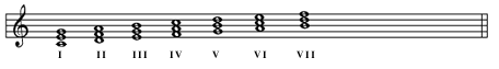 主、属、下属三和弦是正三和弦,正三和弦是一、四、五级和弦。付三和弦通常指二、三、六级三个和弦。现在我们学习II-V、VI-V的连结。下面是C大调的七个三和弦。包括三个正三和弦、三个付三和弦、导和弦。